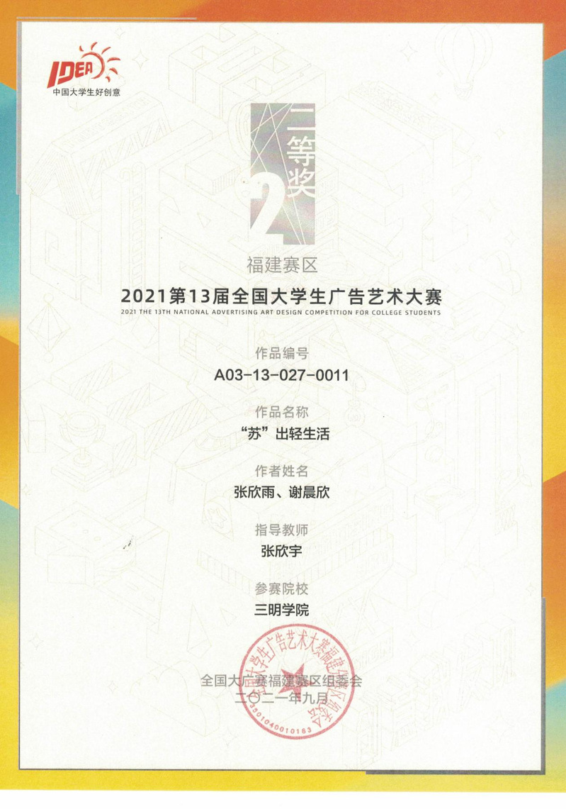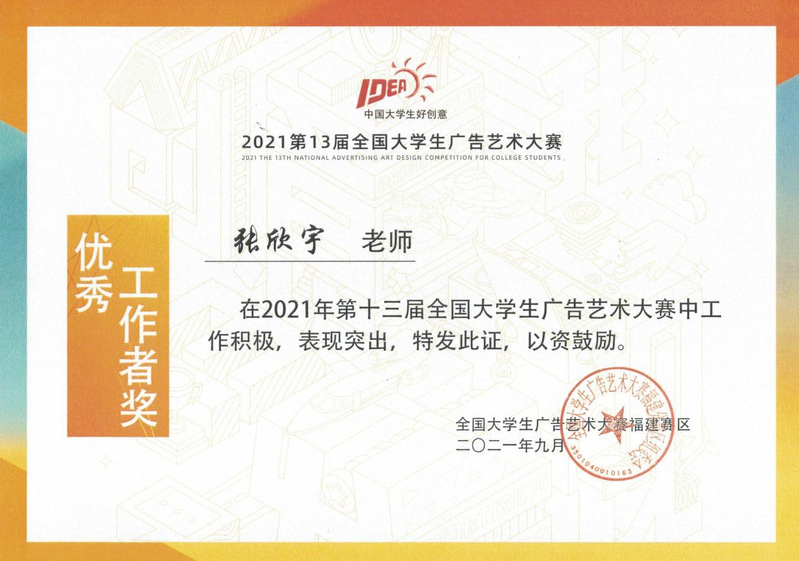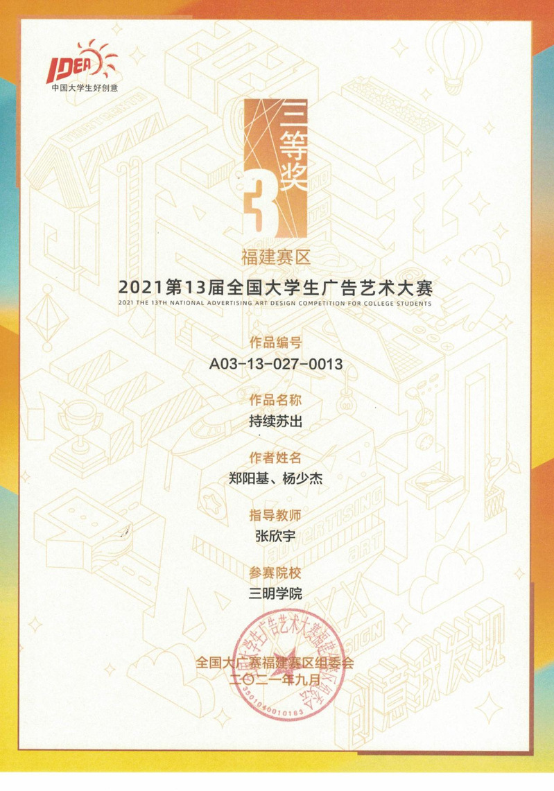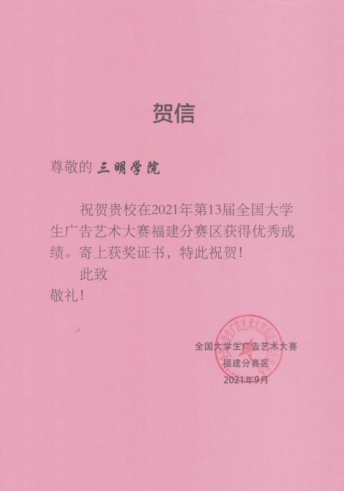 日前,第十三届全国大学生广告艺术大赛评选结果揭晓,艺术与设计学院动画系学子获得国家级二等奖1项,省级二等奖、三等奖各1项,其中我院张欣宇老师获得优秀工作者奖,并且由于比赛成绩优异,福建赛区主委会为yl6809永利官网发来贺信。