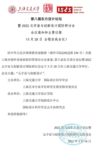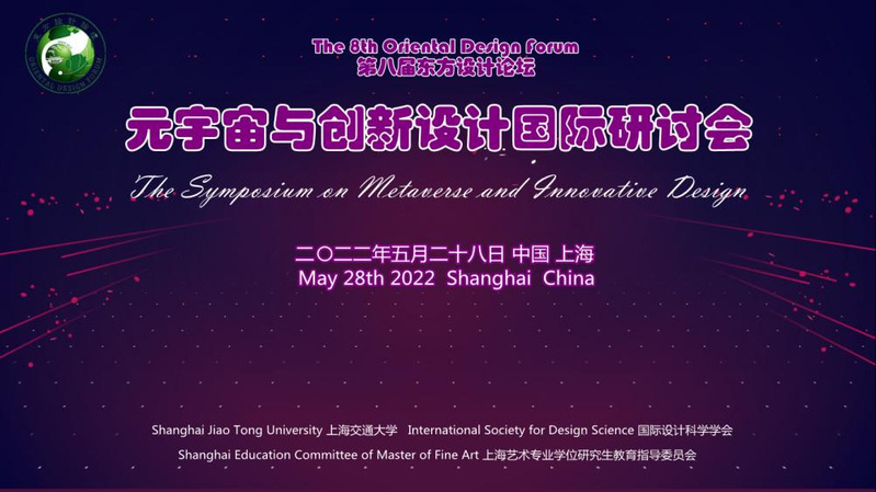 2022年5月28日,由上海交通大学、国际设计科学学会、上海艺术专业学位研究生教育指导委员会联合主办的第八届东方设计论坛暨2022元宇宙与创新设计国际研讨会在上海交通大学举行。来自全国各地以及德国、美国、日本、新加坡、巴西、马来西亚、缅甸、柬埔寨等国家的论文代表、特邀嘉宾和媒体记者共228人出席会议。