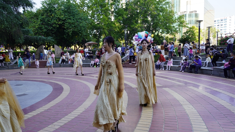 展演现场,随着悠扬的声乐响起,模特们穿着精美的草木染服饰款款走来,先是华夏衣冠体系中自秦汉以来的典型服饰款式,接着近代国服之经典旗袍系列展示着另一番优雅与东方神韵,再者现代之时尚草木染女装一个系列一个系列紧跟着纷纷呈现在观众眼前。周边群众,玩耍的、购物的、路过的,甚至做生意的小摊贩,都纷纷被吸引而来。坐着的、站着的,人山人海,热闹非凡。人群中时而传出“哇!这衣服好美!”“茶叶也能染出这么漂亮的衣服!”“这花朵的图案这么逼真,是怎么弄上去?”“我喜欢那一套。”“这裙子好仙”......