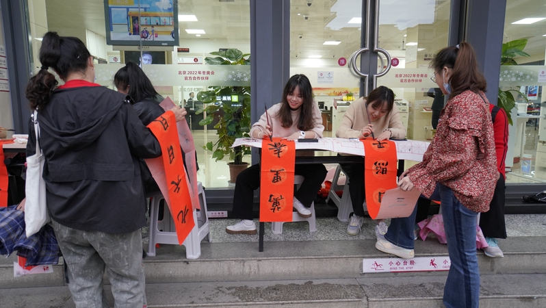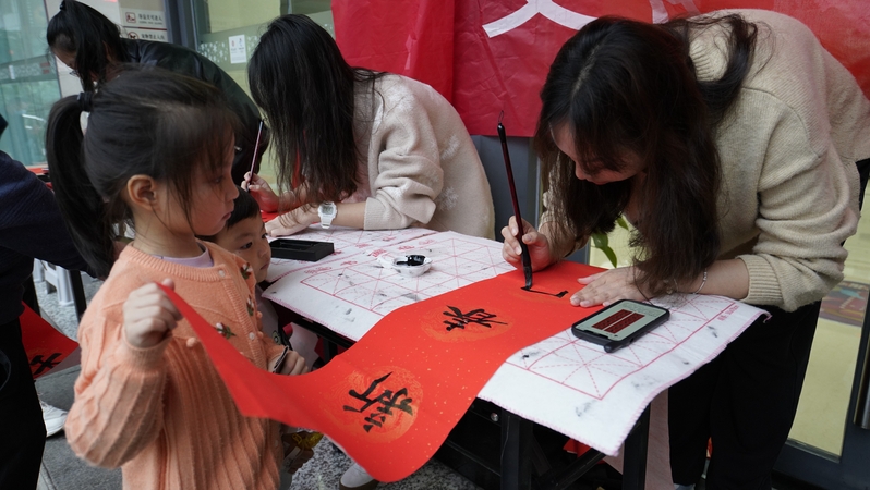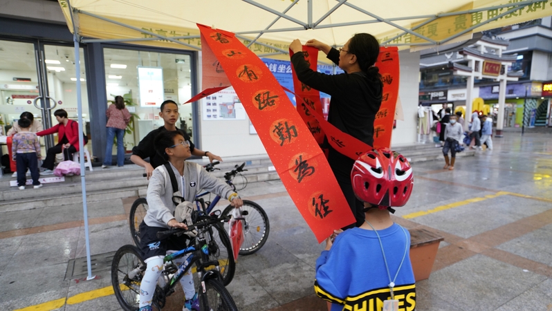 活动现场,艺设学子挥毫泼墨,创作出一幅幅笔酣墨饱、气韵生动的对联,并将作品免费送给现场群众。随后,一些书法爱好者也开始体验毛笔书法,大家一笔一划,劲头十足,用心书写着每一个汉字,现场书香味浓郁。