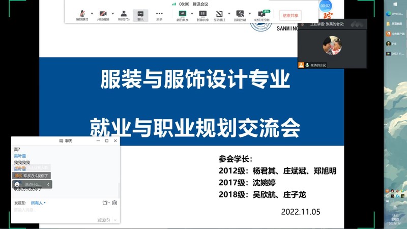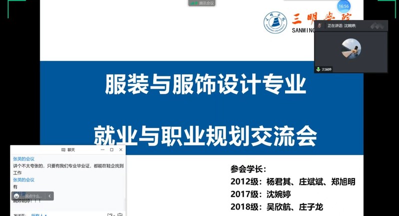 本次分享会共邀请了六位优秀的毕业生嘉宾,分别为2012级杨其君、庄斌斌、郑旭明,2017级的沈婉婷,2018级的吴欣航、庄子龙。张英老师向与会的各位优秀毕业生表达了亲切问候,并说明了本次分享会的活动流程。刘阳老师也对参与分享的嘉宾表示欢迎和感谢。活动通过线上腾讯视频会议的方式进行,由学长学姐介绍了鞋服行业的就业前景、工作环境及自身的工作经历并与学生答疑互动。