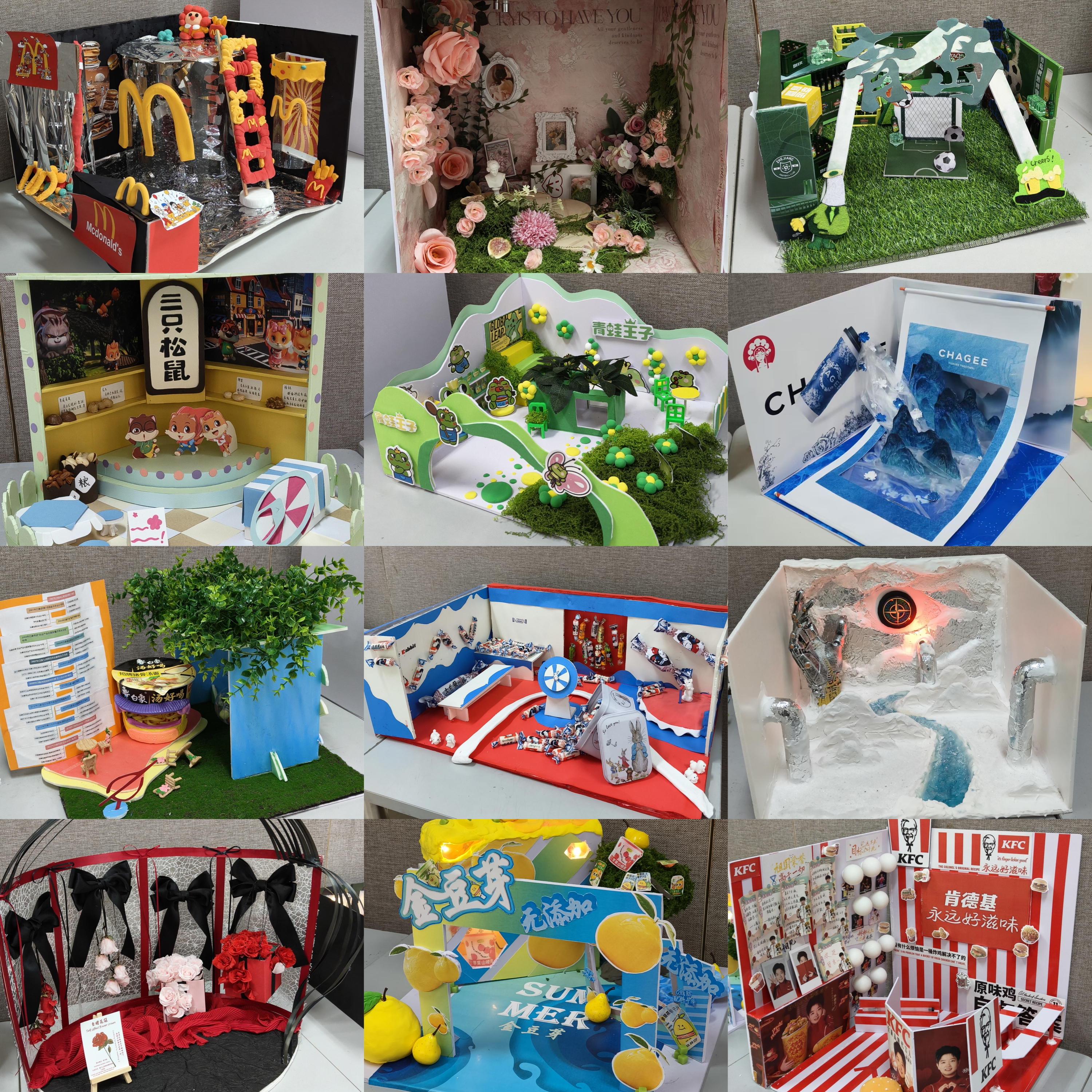 展览聚焦手工创作与品牌氛围再造,以手作模型为切入点,通过实体创作重新诠释品牌DNA,解构经典品牌基因,重构其文化内核与情感共鸣。学生们以知名品牌为样本,通过视觉符号拆解、叙事重构等手法,呈现品牌内核的多元可能性;以“手作模型”为载体,表达实体创作的温度感与叙事性。一件件作品既展现了学生将抽象概念转化为具象作品的创造力,也探索了设计教育中“温度感”与“商业化”的平衡之道,为品牌创新提供了年轻化、艺术化的解决方案。