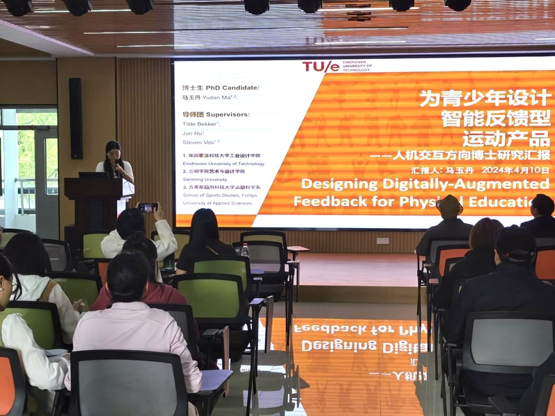 马玉丹博士分享了课题研究“为青少年设计智能反馈型运动产品——人机交互方向”。她以欧洲的青少年为研究对象,从生理和心理层面对增强愉悦体验的体育产品设计进行细致解析,增进了师生们对产品设计的认识。此外,马玉丹博士以荷兰埃因霍温科技大学工业设计学院的发展为例,介绍了设计领域的发展与现状,激发了师生的科研探索欲。