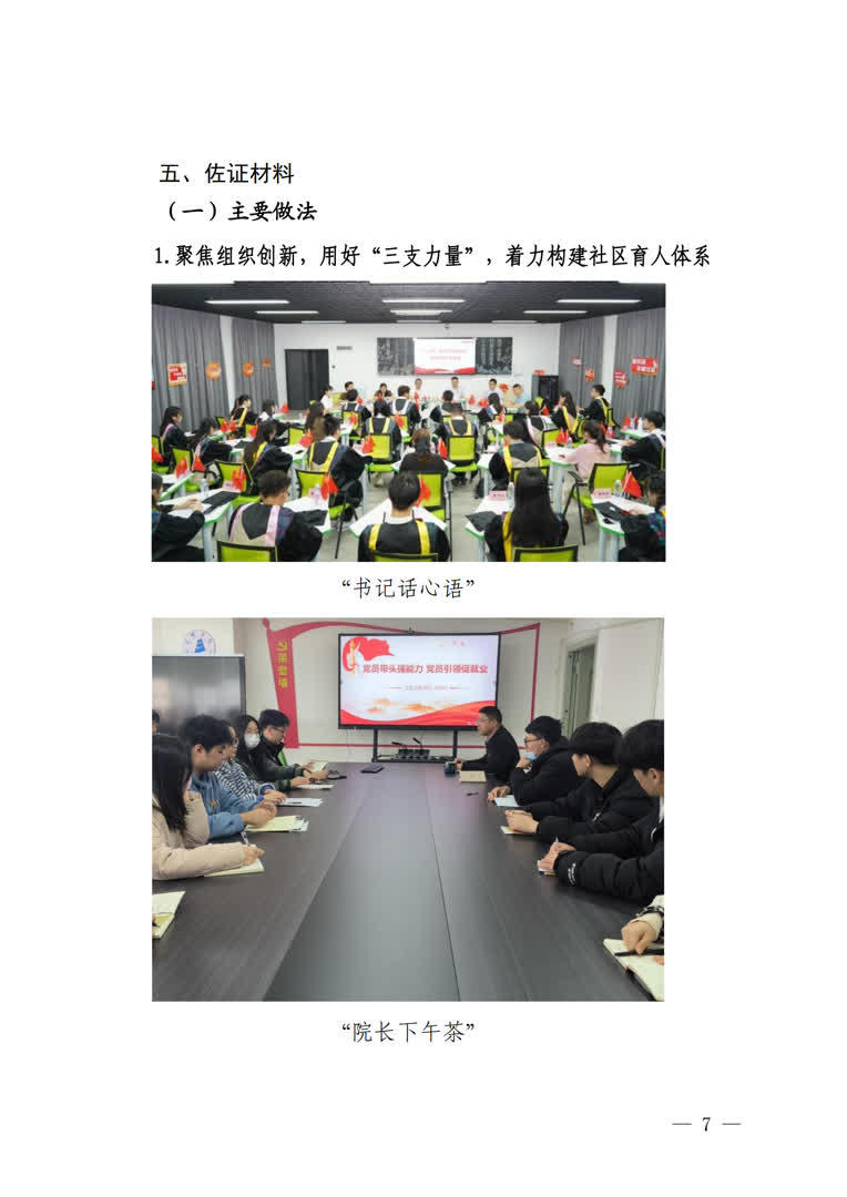 (二)聚焦载体创新,搭好“三个平台”,着力打造社区育人模式。支部坚持将学生社区作为加强党对学生工作领导的重要阵地,抓好学生社区服务平台建设,将党建融入“万家灯火”,把服务送到“千家万户”。一是打造思政教育“淬炼区”。打造了一批集“三化”平台、党(团)员志愿服务站、新时代文明实践中心等功能于一体的学生宿舍楼栋活动室,实现“三会一课”等向学生社区延伸;开展“七点半微党课”,在学生社区浸入式开展学习教育发挥党建引领功能。二是打造专业提升“学习区”。构建“专业教师+辅导员+朋辈”学业辅导体系,组织学业导师“一对一”“名师专家来把脉”,做好学生的政治引领和思想引领、学业辅导、心理疏导以及生活指导工作,营造比学赶超的浓厚学习氛围。三是打造实践锻炼“拓展区”。将美育、劳育与思政教育深度融合,推进艺术类等社团进社区,开展“‘寝’你一起,‘寓’见美好”宿舍文化节等楼栋品牌活动,覆盖全体学生;结合文明宿舍创建、社区志愿服务,以“项目化”形式引导学生身体力行开展社区劳动,涵养“自讨苦吃”精气神。