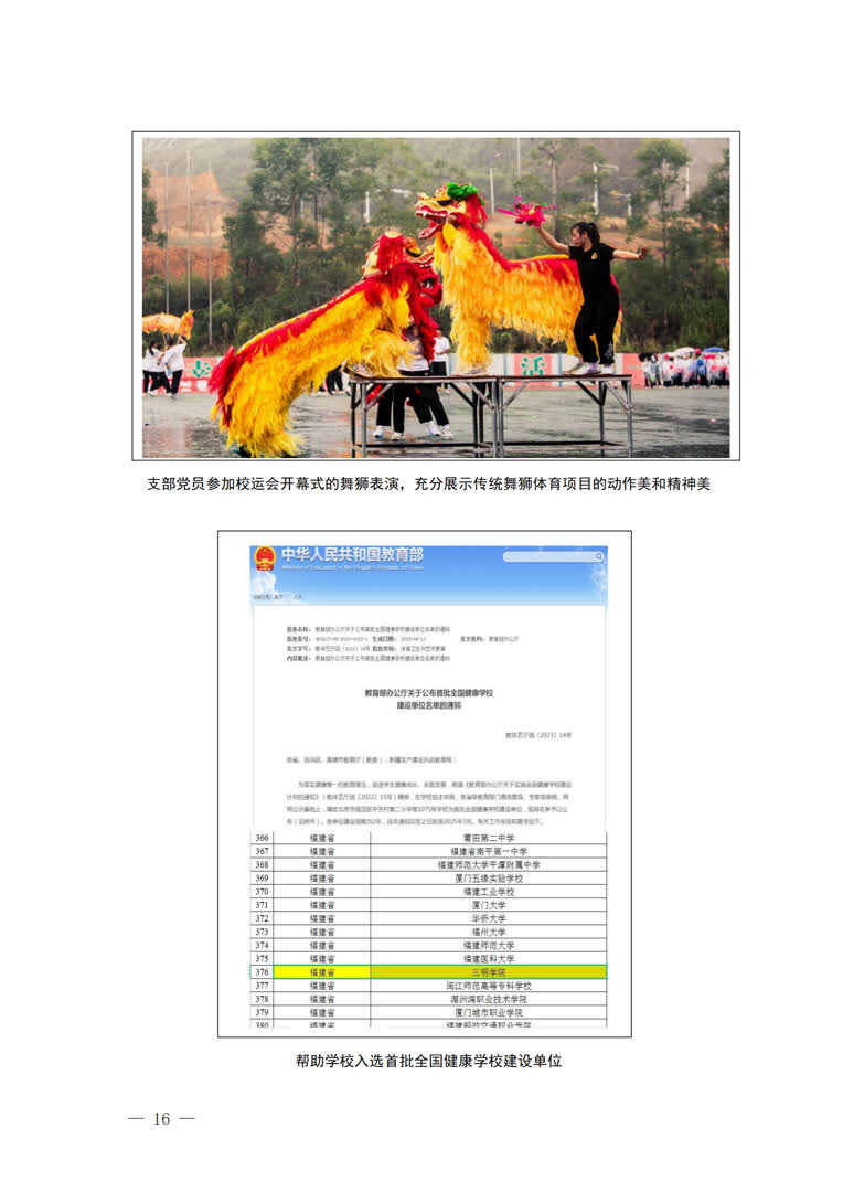 1.以体为本,思想与学业并进。将支部建设与人才培养、专业建设深度融合,帮助党员从思想到行为、从理论到实践都得到历练,综合素养得到有效提升,形成“人人有获奖、人人有事做、人人有贡献”的良好局面。落实高质量就业,2022和2023届毕业生党员均实现100%就业,共有35人考研升学、教招上岸。近2年,上百人次在首届世界龙舟联赛、福建省运动会(大学生部)、大学生职业生涯规划等省级及以上赛事中获奖。