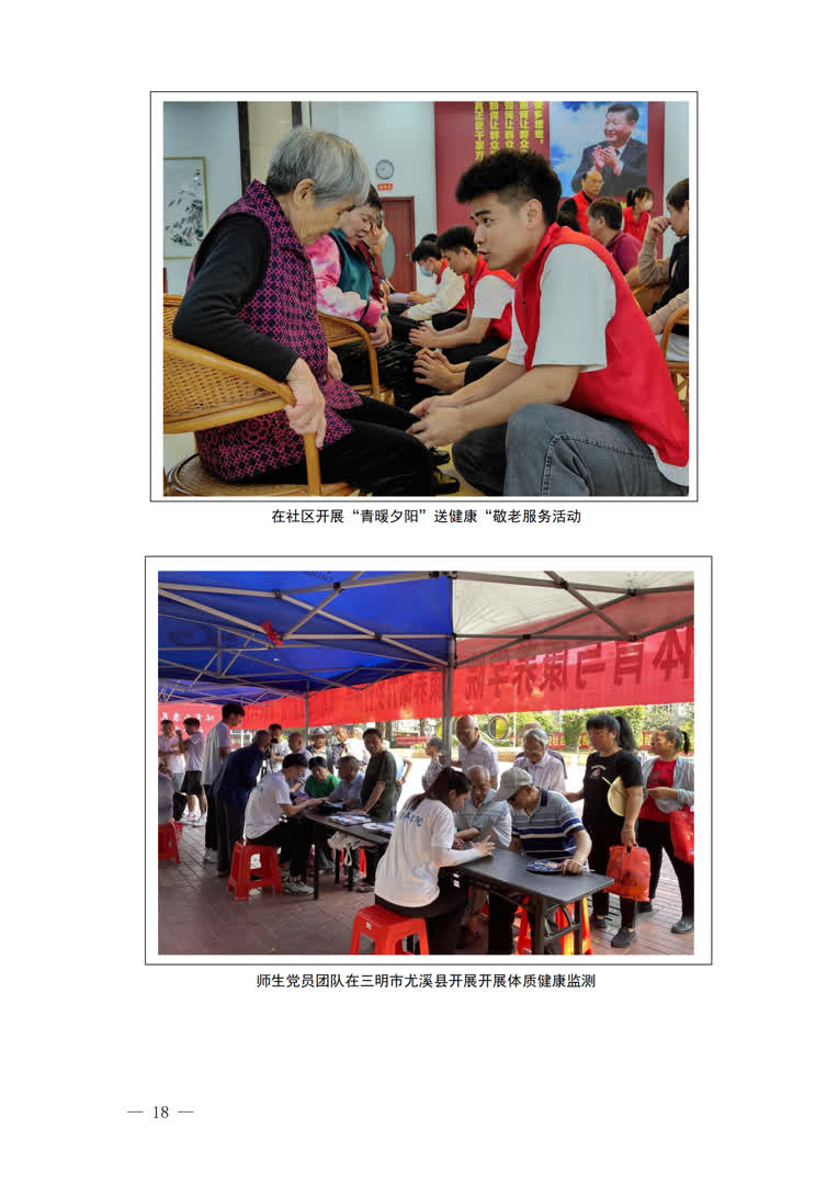 (3)体卫融合筑“健康梦”。联动教工党支部,组建师生党员先锋服务队开展“运动治未病”健康服务。先后到三明市12个区县开展体质健康监测与康养DIY服务,协助党员教师开展主题康养知识讲座15场,开具“运动处方”超10000份,有效助力三明作为全国医改先行区体卫融合模式的探索与改革。
