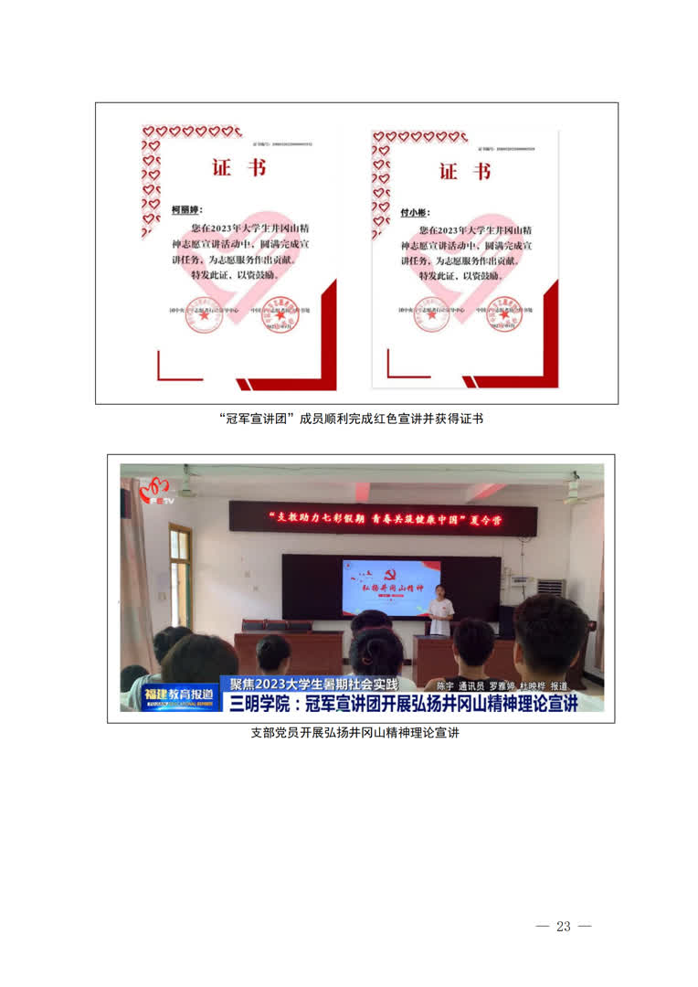 2.以体为用,实践与服务协同。延伸校内,实现党员进社区、班级、部门、社团(协会)和训练队范围的全覆盖,打通了服务群众的“最后一公里”。指导开展12项大型体育赛事600余场,浓厚“周周有训练,月月有比赛”校园体育文化氛围,帮助学校入选全国首批健康学校创建单位。辐射校外,连续3年开展“体育助双减”、体质健康测试和姚基金公益支教等志愿服务项目,为体育强国和健康中国建设贡献青春力量。两个公益项目获评福建省民政厅、福建省慈善总会组织奖。