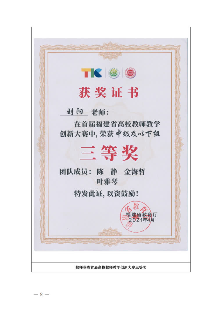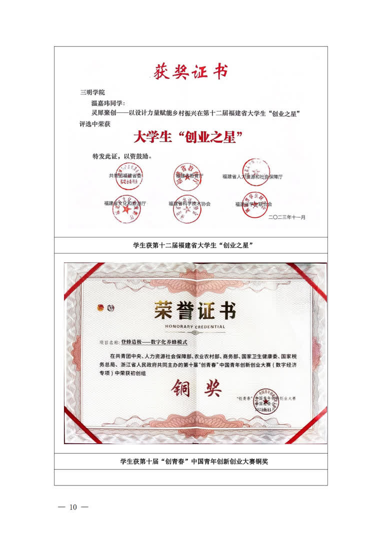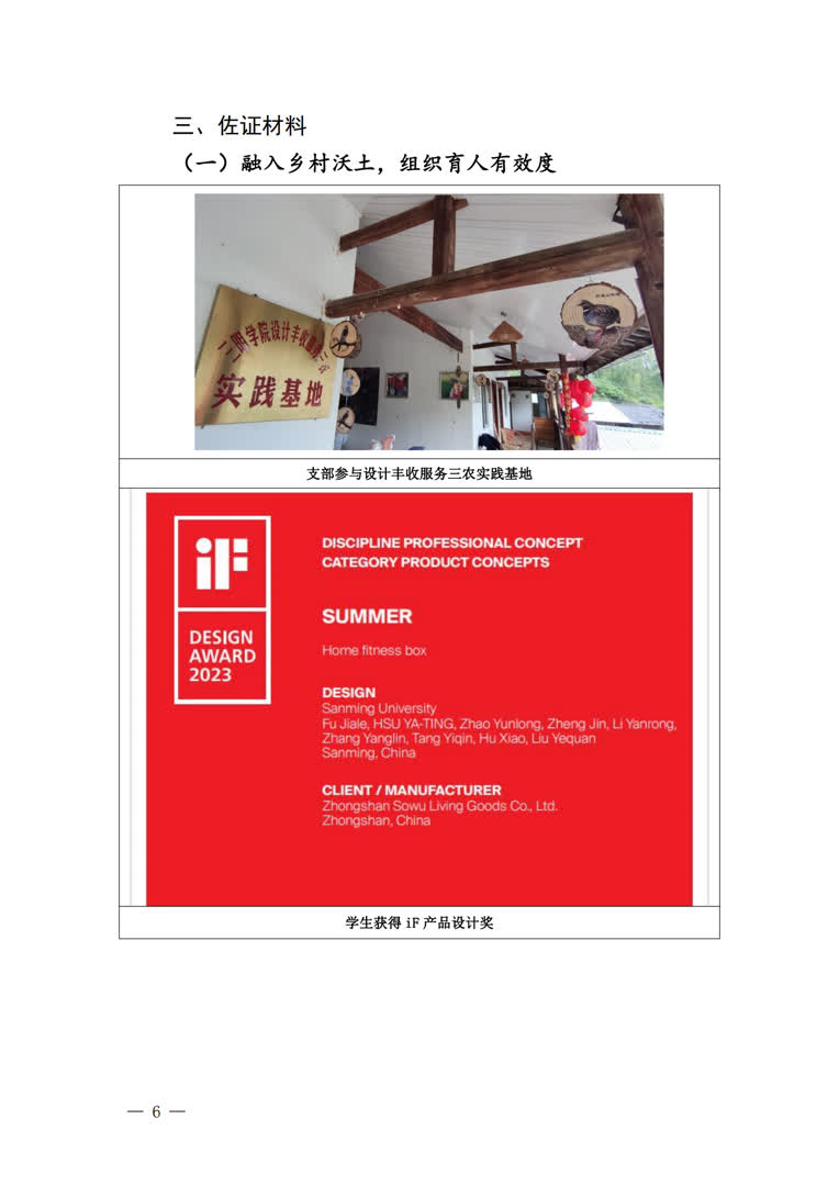 1.融入乡村沃土,组织育人有效度。支部带领台湾教师在三明乡村大地上推动创新创业实践,为闽台师生交流互动搭建平台,增强了支部辐射力和凝聚力。近几年,党员指导学生获得中国国际“互联网+”大学生创新创业大赛金银奖,在首届“两山杯”全国大学生乡村振兴创新创意创业大赛上获特等奖,还获得德国红点设计奖、iF产品设计奖等国际、国家级奖76项,省级奖励133项,各类专利179项。