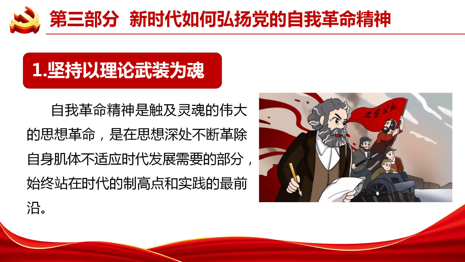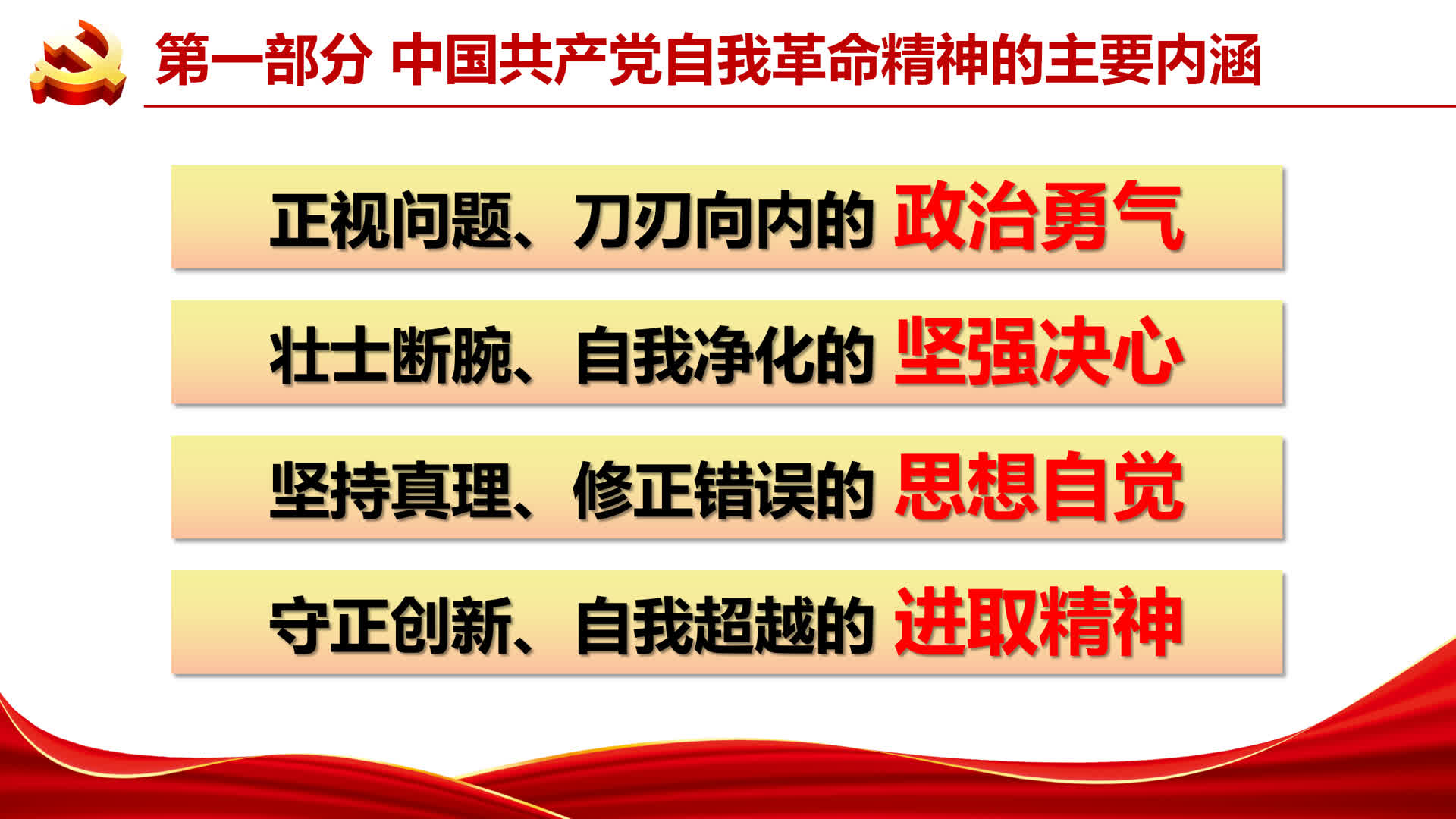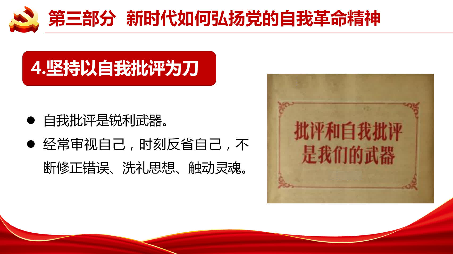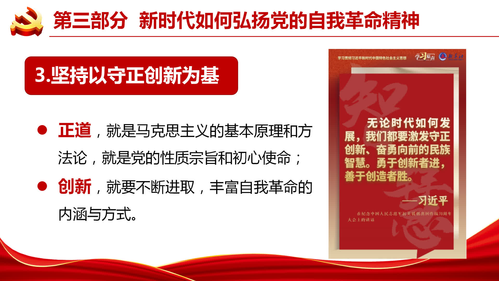 3.坚持以守正创新为基。坚持守正创新是弘扬自我革命精神的基本要求。守正就是坚守正道。正道,就是马克思主义的基本原理和方法论,就是党的性质宗旨和初心使命。创新就要不断进取,丰富自我革命的内涵与方式。当下守正创新推动思政课建设内涵式发展,要求高校教师不断丰富思政课教学内容,创新教学方法形式手段,切实把道理讲深讲透讲活,不断提高思政课的针对性和吸引力。