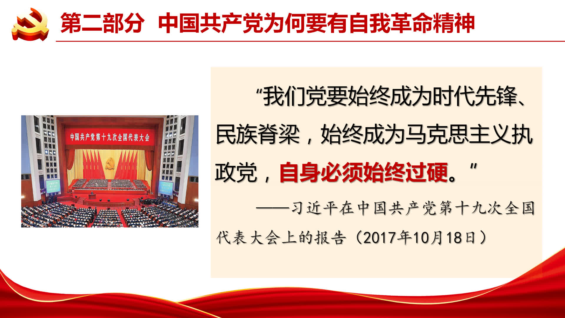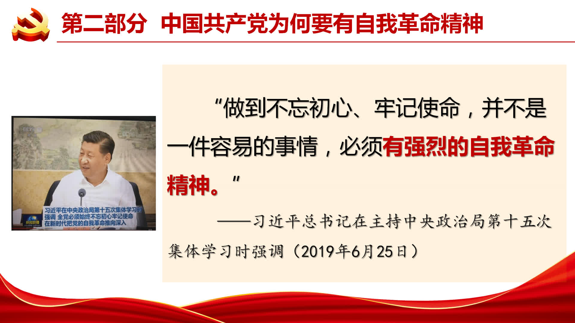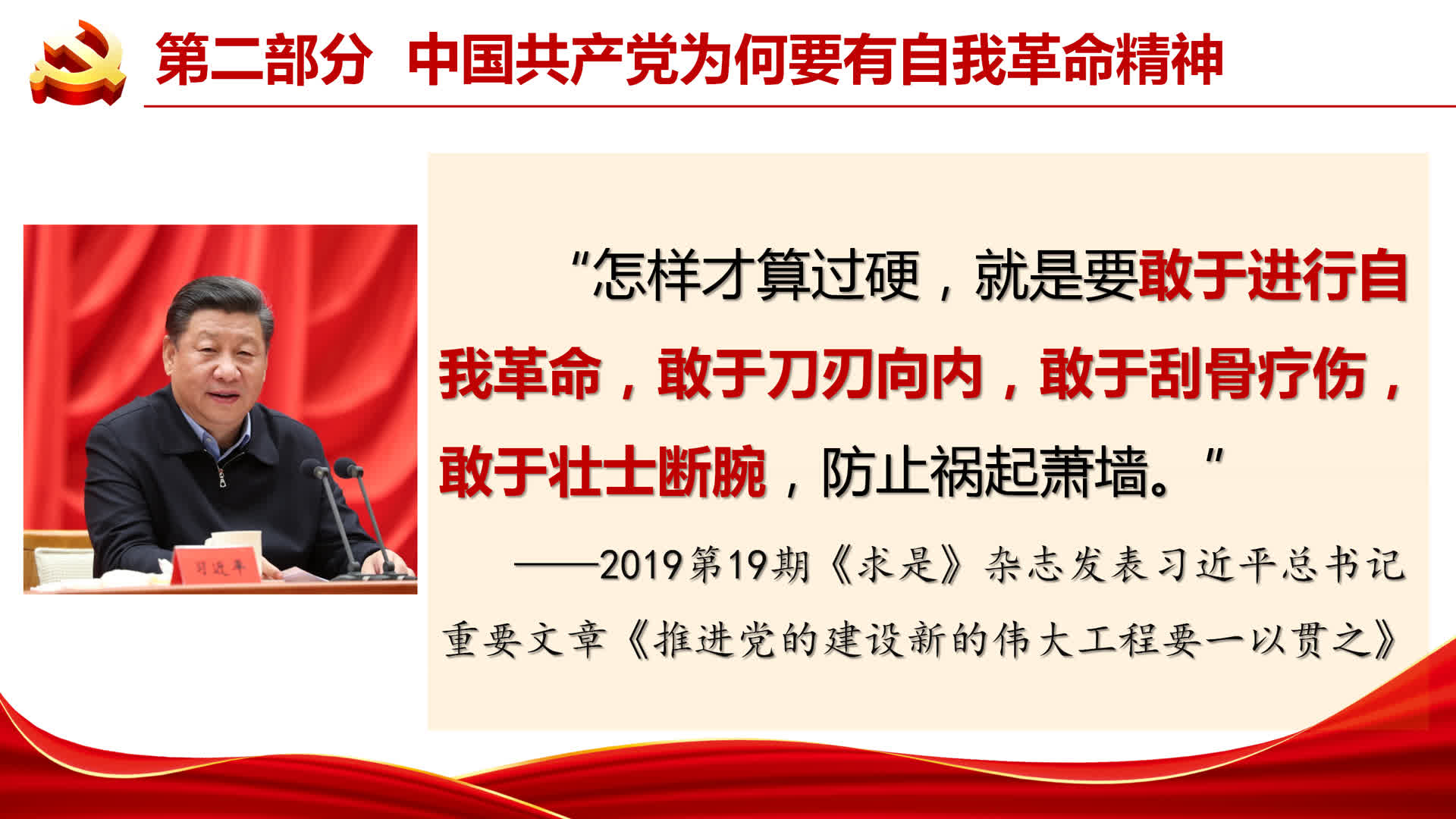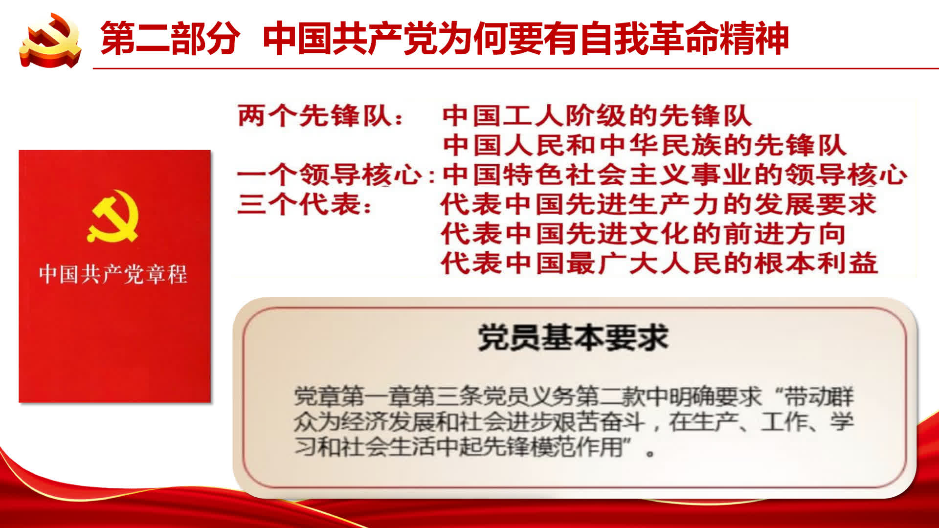 《中国共产党章程》开宗明义强调党的性质,概括为两个先锋队,一个领导核心,“三个代表”。也明确规定:党员要在生产、工作、学习和社会生活中起先锋模范作用。“党要始终成为时代先锋、民族脊梁,始终成为马克思主义执政党,自身必须始终过硬。”“怎样才算过硬,就是要敢于进行自我革命。”“要把新时代坚持和发展中国特色社会主义这场伟大社会革命进行好,我们党必须勇于进行自我革命,把党建设得更加坚强有力。”“做到不忘初心、牢记使命,并不是一件容易的事情,必须有强烈的自我革命精神。”