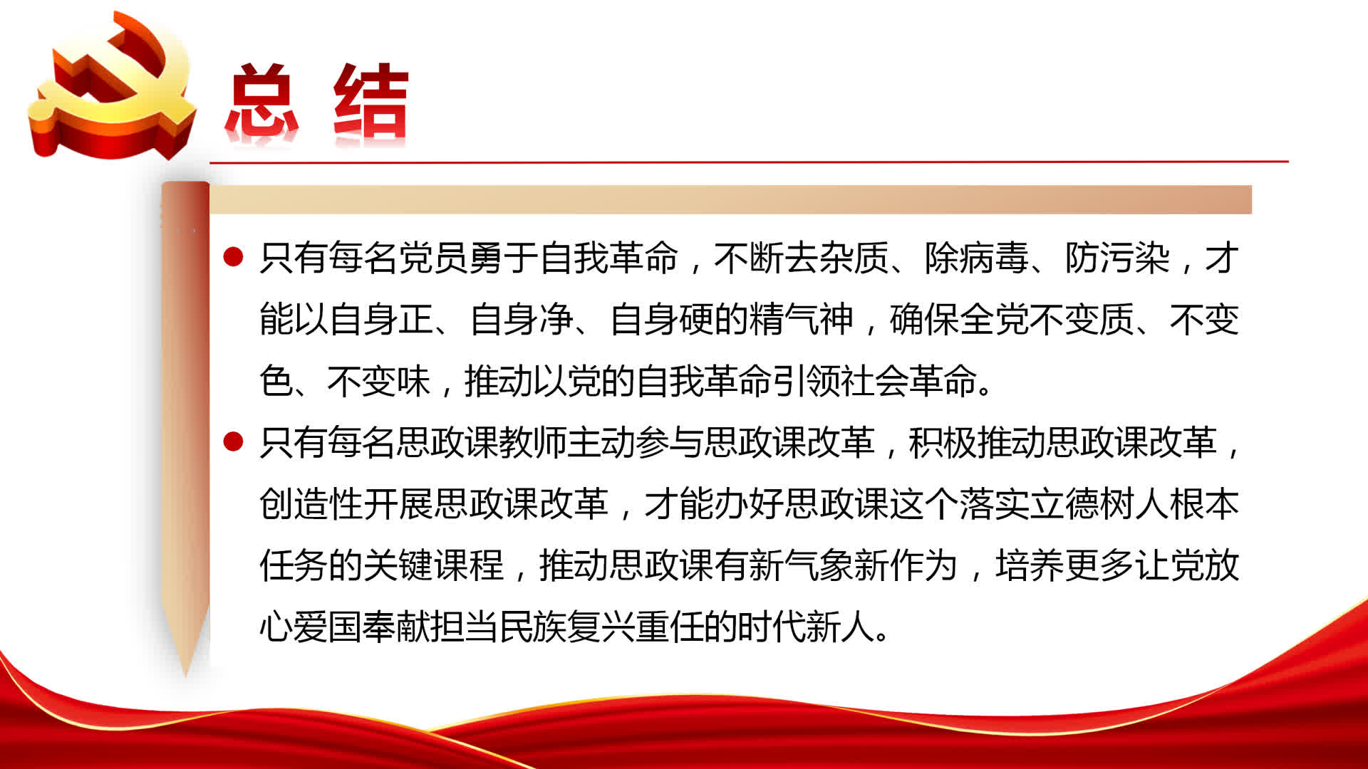 党员是党的肌体的细胞,细胞永远健康,党的肌体才会永葆活力。只有每名党员勇于自我革命,不断去杂质、除病毒、防污染,才能以自身正、自身净、自身硬的精气神,确保全党不变质、不变色、不变味,推动以党的自我革命引领社会革命;只有每名思政课教师主动参与思政课改革,积极推动思政课改革,创造性开展思政课改革,才能办好思政课这个落实立德树人根本任务的关键课程,推动思政课有新气象新作为,培养更多让党放心爱国奉献担当民族复兴重任的时代新人。