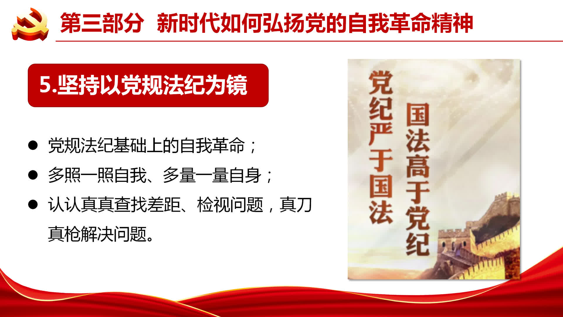 5.坚持以党规法纪为镜。中国共产党的自我革命精神,是在党规法纪基础上的自我革命和自我建设。以党规法纪为镜,多照一照自我、多量一量自身,时刻紧绷自律之弦,认认真真查找差距、检视问题,真刀真枪解决问题,永葆共产党人的政治本色。加强纪律性,革命无不胜。当前,党纪学习教育正在全党开展。高校教师要以警示教育为契机,瞄准高线、认清红线、守牢底线,努力成长为“政治强、情怀深、思维新、事业广、自律严、人格正”的思政课教师。